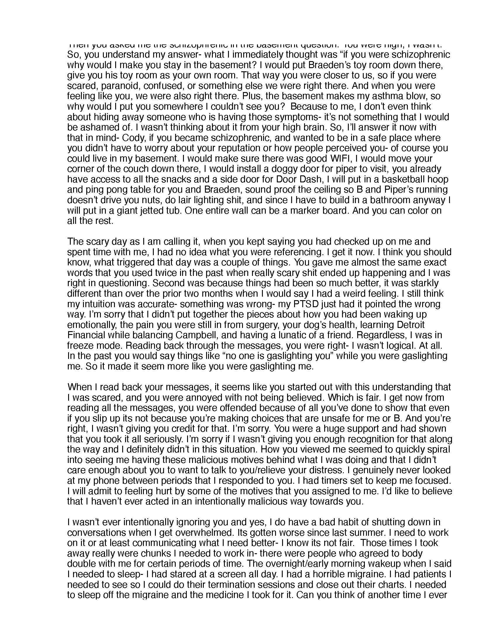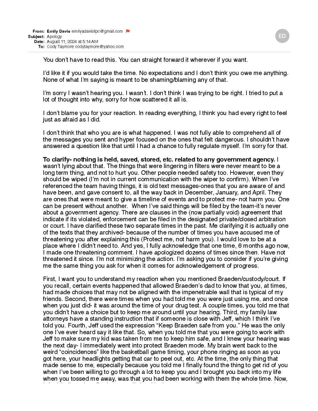 Emily would often cry in front of me, saying "Cody please I don't want to lose everything and lose my child." She claimed Reily and Mark were stalking her child, posting pictures of him online, threatening his safety. She painted scenarios where I was somehow responsible for putting him in danger through my connection to these supposed threats.