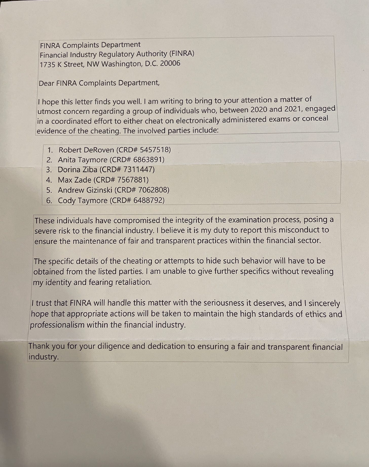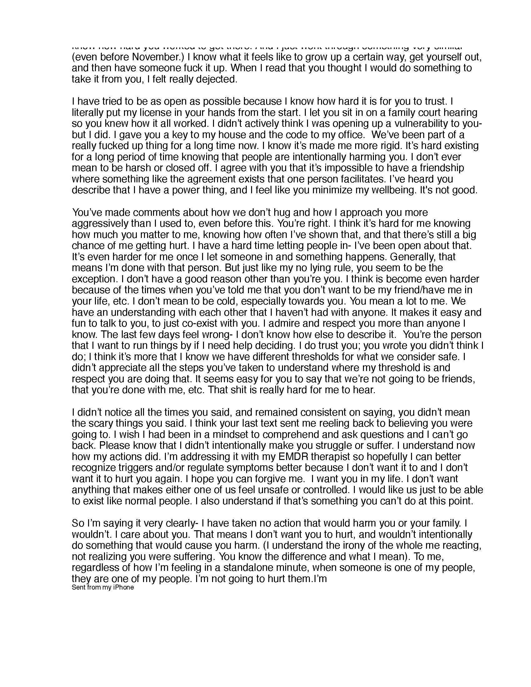 By February 2024, Emily had constructed her masterpiece of manipulation. Anonymous texts arrived listing my FINRA identification number, followed by threatening letters with false allegations — never actually sent to FINRA, just meant to terrorize me. Here is what was sent to my house with the names of family members and friends and EVEN my recently dead best friend.