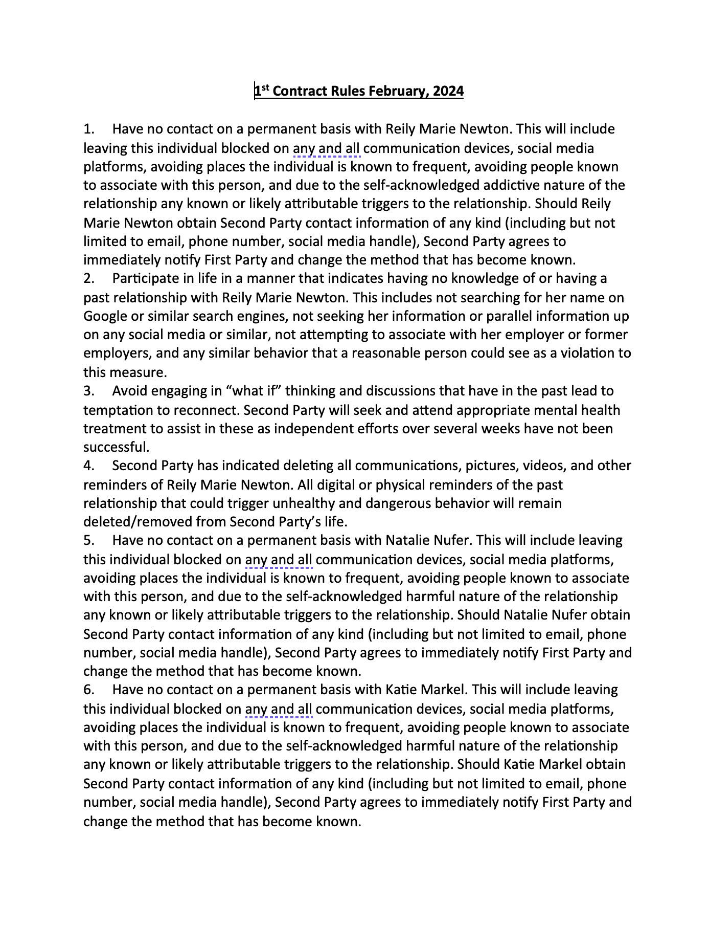 She had names for all of them: Egla Kishta, Alexis Smith, Natalie Nufer, Hannah Soroka, Katie Markel, Abby McCoy, Alexis Carter. Women from my past who she claimed were "unstable" and "dangerous." I was ordered to block them all.