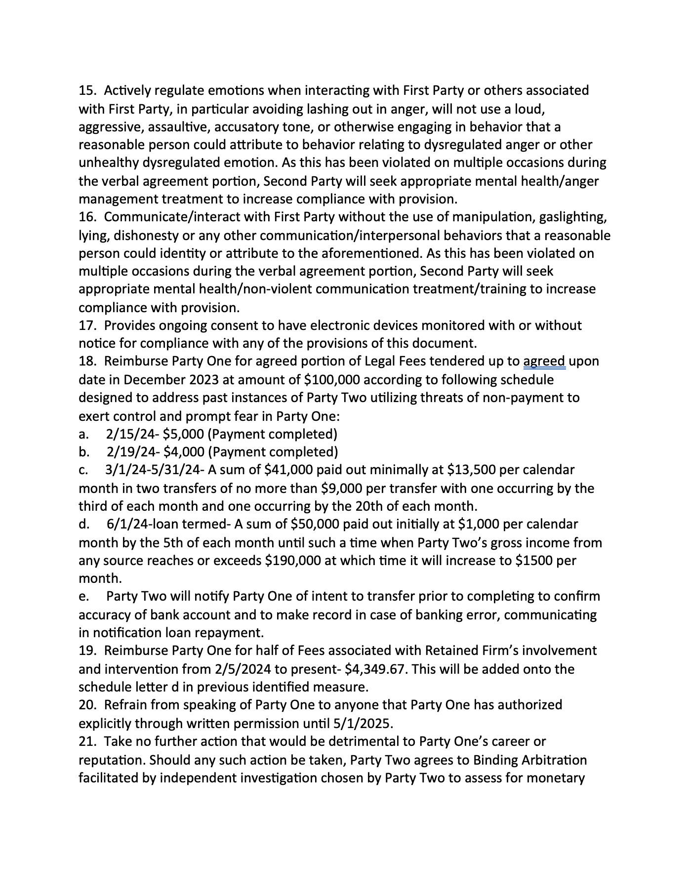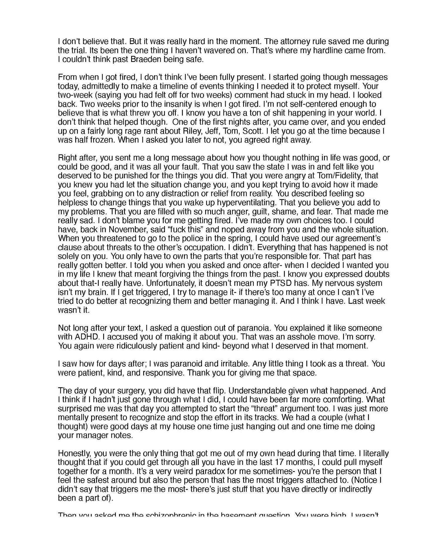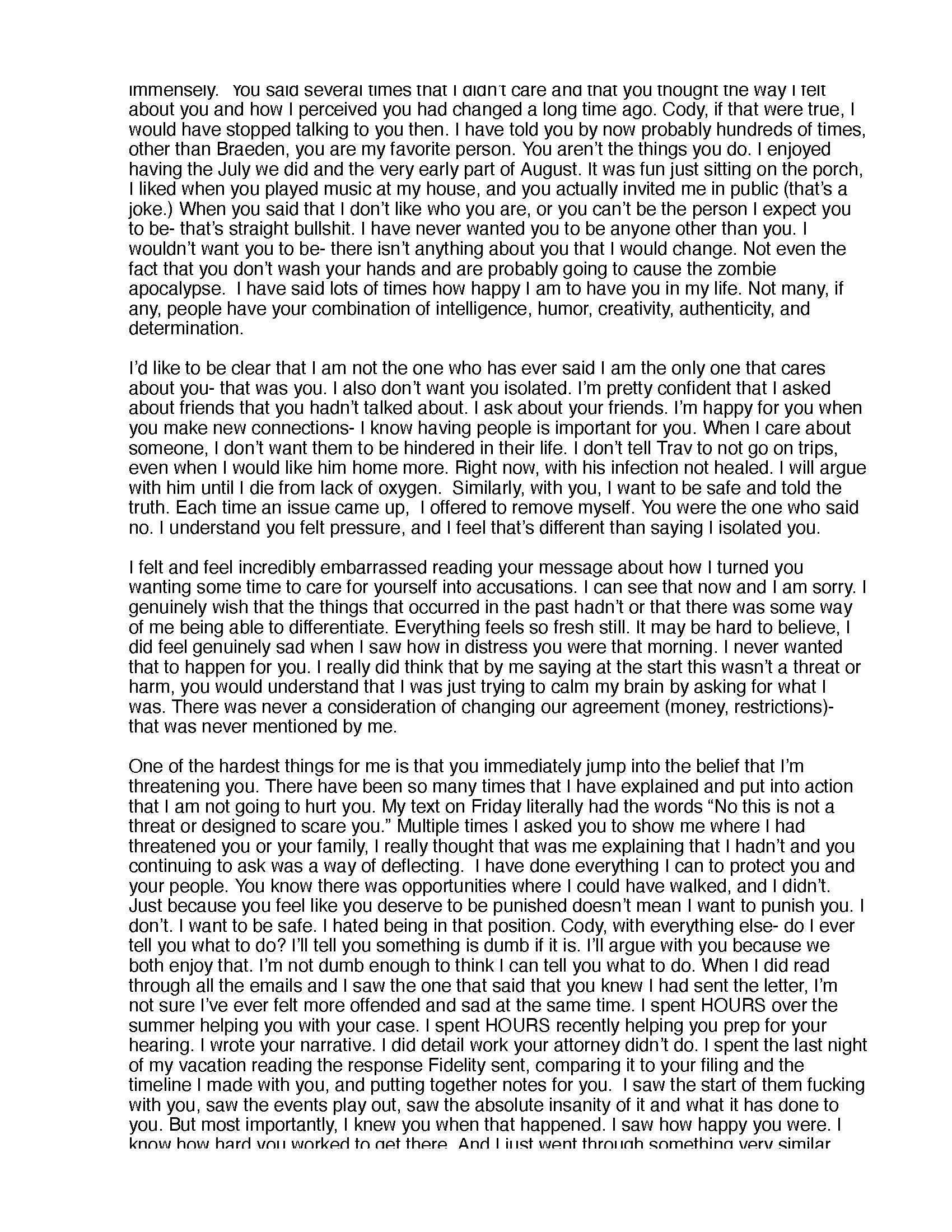 Emily was often crying in front of me, saying "Cody please I don't want to lose everything and lose my child." She claimed Reily and Mark were going to bombard FINRA with false complaints about me, destroying my one shot at clearing my professional record through my pending arbitration case.